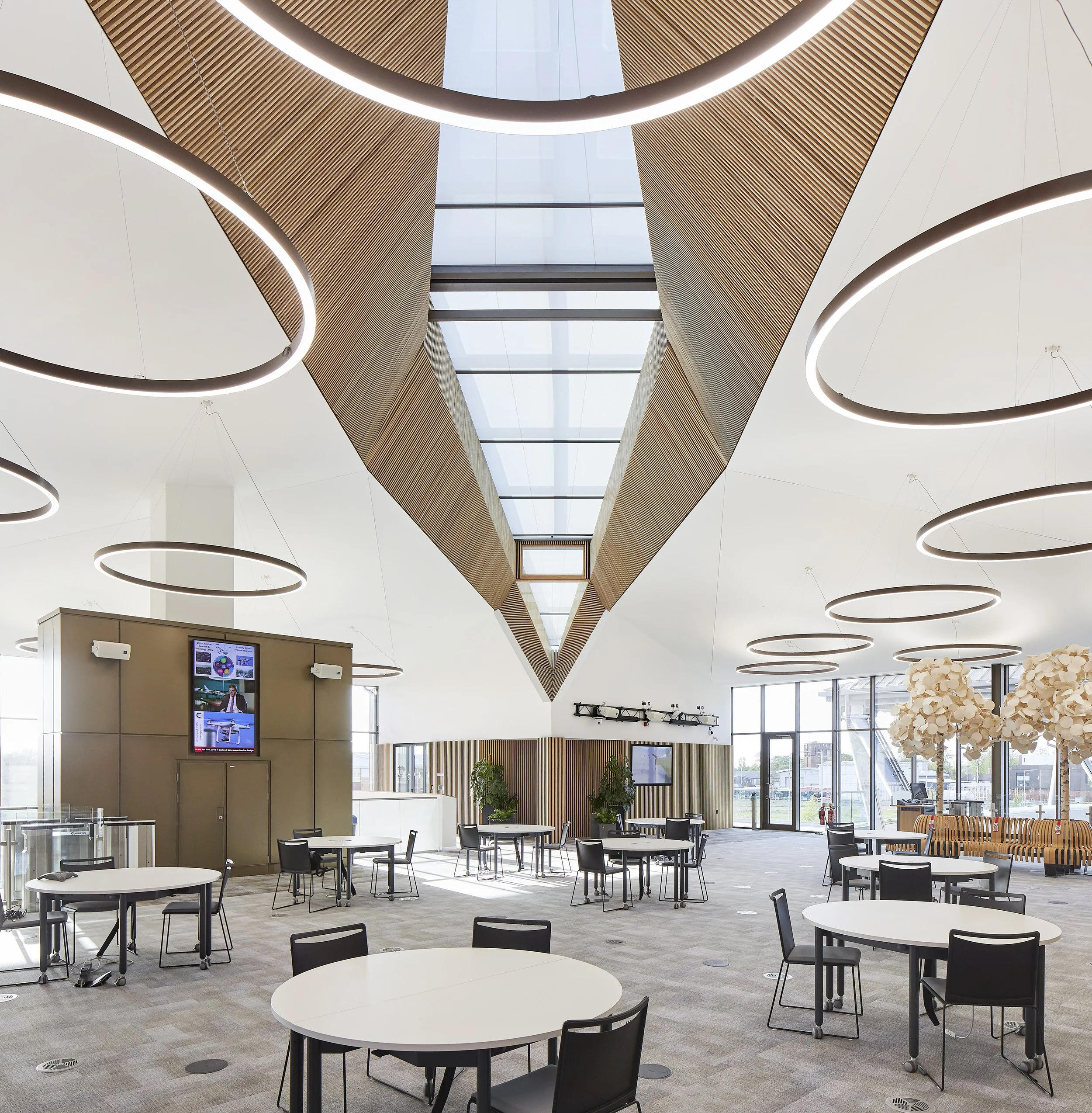Internal organisation is around large open plan areas at each level, connected by a double storey volume, accessible to the wider public. These areas support modular laboratories and research spaces around their periphery, occupied by both academics and private sector partner organisations. This allows a degree of autonomy, demanded by the commercially sensitivity research, along with an ability to come together and work collaboratively.