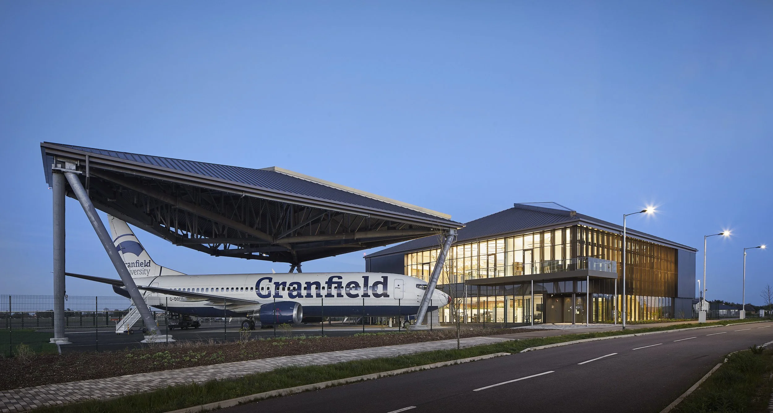 The building establishes a positive connection to the campus and university community around it, welcoming the people into its public areas, and allowing it’s messaging to be highly visible: an unusual innovation for a university research institute. As part of a new masterplan for the campus, DARTeC will become the first visible signal that visitors have arrived at Cranfield, aligning the University’s Boeing 737 in its new canopied enclosure, with the new main campus approach road.
